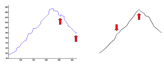 (Left) breaking silhouettes at curvature maxima works poorly if there are small details, noise, or rasterization artifacts